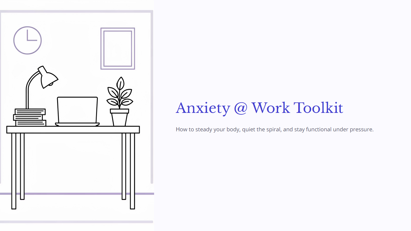 Work anxiety can make it hard to focus, communicate clearly, and feel steady under pressure. This free MINDSHIFTERS toolkit offers simple, safe practices you can use at your desk, before meetings, and during stressful moments — to calm your body, quiet the spiral, and choose your next step with clarity.